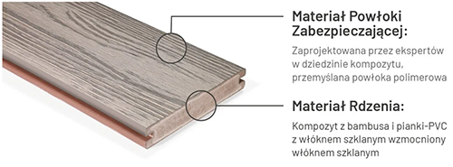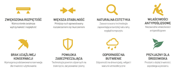 Każda deska Apex pokryta jest ochronną powłoką z akrylowego polimeru, która zapewnia wyjątkową odporność na blaknięcie, zarysowania, plamy oraz działanie czynników atmosferycznych. Dzięki temu jest to rozwiązanie niemal bezobsługowe – idealne dla najbardziej wymagających użytkowników.