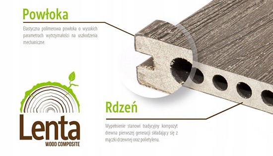 Powłoka zewnętrzna to nie tylko funkcja ochronna lecz również estetyczna odzwierciedlająca strukturę powierzchni drewna oraz występująca w różnych kolorach. Tarasowe deski kompozytowe Lenta zostały wyróżnione w konkursie im. Stanisława Staszica Laur Innowacyjności 2018. Organizatorem konkursu jest Naczelna Organizacja Techniczna.